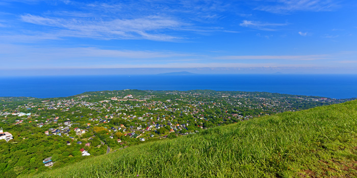 伊豆では、断崖や島々が美しい海、打ち寄せる波や砂浜が綺麗なビーチ、山や丘など高台から緑や街越しに眺める広大な景色、目の前がオーシャンブルー一色など、実に様々な海の眺望が楽しめます。